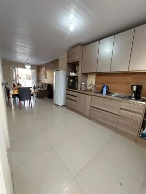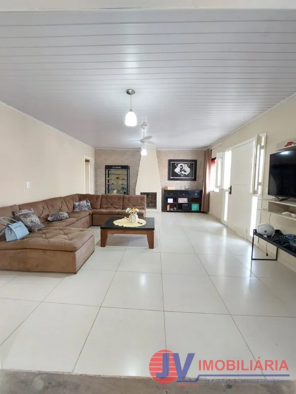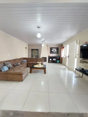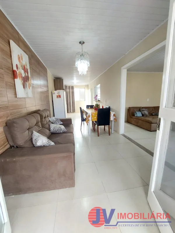 A casa oferece 3 dormitórios, sendo 1 suíte, closet, além de banheiro social, cozinha, sala de jantar e uma ampla sala de estar com lareira, piso cerâmico e forro em PVC.